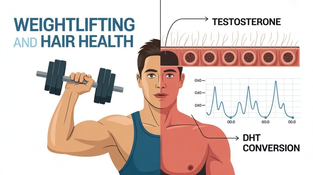 Weight training can slightly raise testosterone, which may convert to DHT. However, this is only a concern for people who are genetically prone to male-pattern baldness. For most healthy adults, regular lifting does not trigger hair loss.